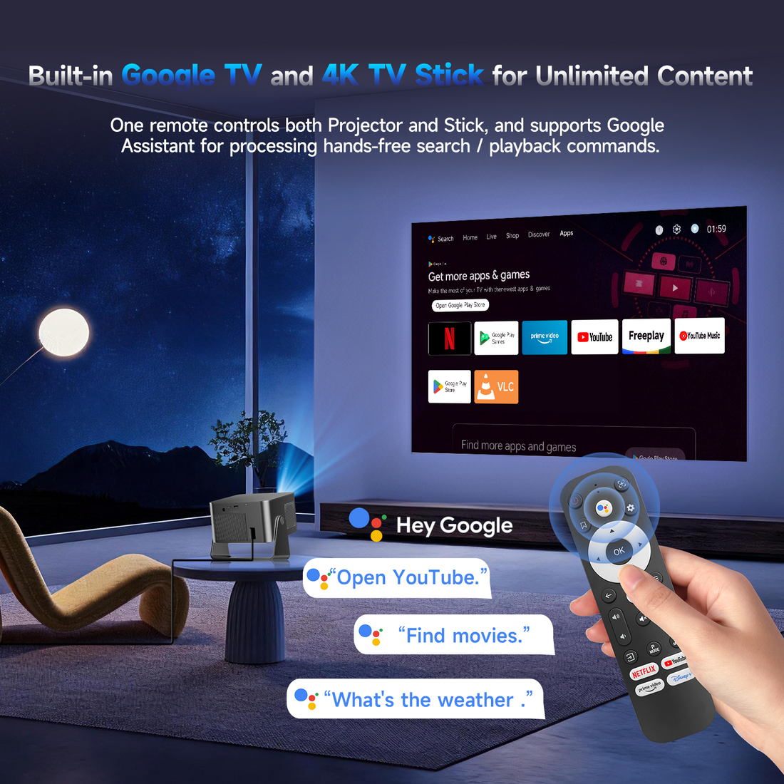 - Google TV OS with built-in apps